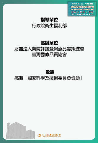 指導單位 行政院衛生福利部 協辦單位 財團法人醫院評鑑暨醫療品質策進會 臺灣醫療品質協會 致謝 感謝「國家科學及技術委員會資助」