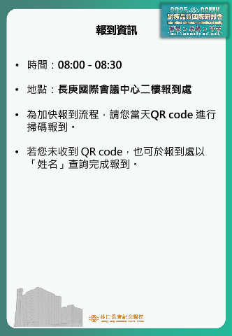 報到資訊 • 時間:08:00 - 08:30 • 地點:長庚國際會議中心二樓報到處 • 為加快報到流程,請您當天QR code 進行 掃碼報到。 • 若您未收到 QR code,也可於報到處以 「姓名」查詢完成報到。