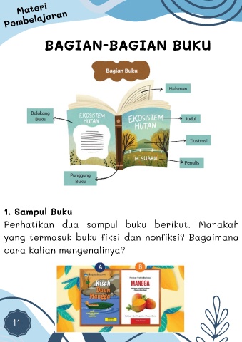 Materi Pembelajaran BAGIAN-BAGIAN BUKU 1. Sampul Buku Perhatikan dua sampul buku berikut. Manakah yang termasuk buku fiksi dan nonfiksi? Bagaimana cara kalian mengenalinya? 11