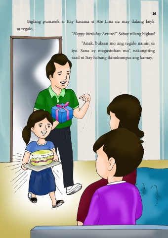Biglang pumasok si Itay kasama si Ate Lina na may dalang keyk at regalo.%u201cHappy birthday Arturo!%u201d Sabay nilang bigkas!%u201cAnak, buksan mo ang regalo namin sa iyo. Sana ay magustuhan mo%u201d, nakangiting saad ni Itay habang ikinukumpas ang kamay.14