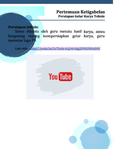 Pertemuan Ketigabelas Persiapan Gelar Karya Teknis Persiapan teknis: Siswa dibantu oleh guru menata hasil karya, siswa bergotong royong mempersiapkan gelar karya, guru memutar lagu P5. Link vidio : https://youtu.be/Lz7Drdz-vLg?si=lsjg2DVtGUNOsD9S