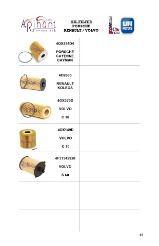 OIL FILTER PORSCHE RENAULT / VOLVO 4OX254D4 PORSCHE CAYENNE CAYMAN 4O2605 RENAULT KOLEOS 4OX370D VOLVO C 30 4OX149D VOLVO C 70 4F31342920 VOLVO S 60 46