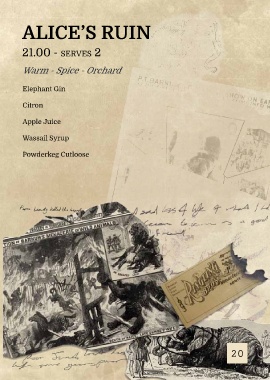 alIce’s ruIn 21.00 - seRves 2 Warm - Spice - Orchard elephant Gin citron Apple Juice wassail Syrup powderkeg cutloose inspiration: Wassail, 11th Century 20