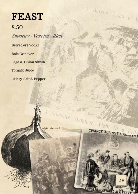 Feast 8.50 Savoury - Vegetal - Rich belvedere vodka bols Genever Sage & Onion Shrub Tomato Juice celery Salt & pepper inspiration: Mrs Beeton’s Book of Household Management 1861 28