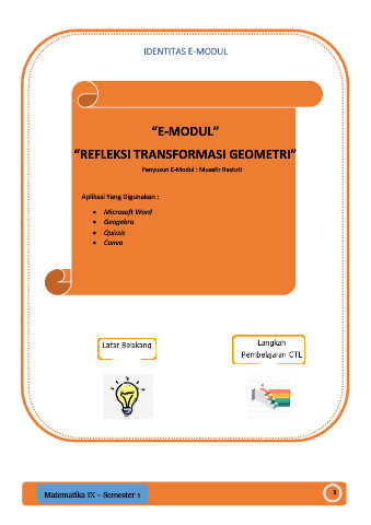IDENTITAS E-MODUL “E-MODUL” “REFLEKSI TRANSFORMASI GEOMETRI” Penyusun E-Modul : Musafir Rastuti Aplikasi Yang Digunakan : • Microsoft Word • Geogebra • Quizziz • Canva Matematika IX – Semester 1 2 ii