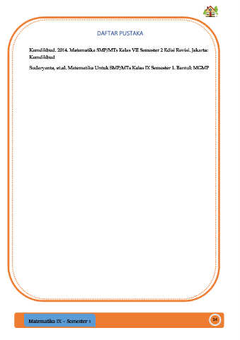 DAFTAR PUSTAKA Kemdikbud. 2014. Matematika SMP/MTs Kelas VII Semester 2 Edisi Revisi. Jakarta: Kemdikbud Sudaryanta, et.al. Matematika Untuk SMP/MTs Kelas IX Semester 1. Bantul: MGMP Matematika IX – Semester 1 20 14