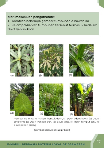 singkong, (c) Daun Pandan duri, (d) daun talas, (e) daun rumpur teki, (f)