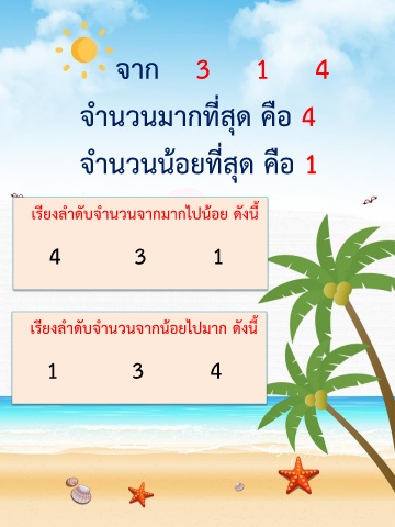 จาก 3 1 4 จ านวนมากที่สุด คือ 4 จ านวนน้อยที่สุด คือ 1 เรียงล าดับจ านวนจากมากไปน้อย ดังนี้ 4 3 1 เรียงล าดับจ านวนจากน้อยไปมาก ดังนี้ 1 3 4