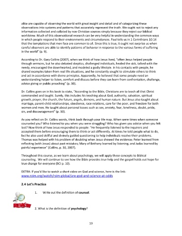 According to Dr. Gary Collins (2007), when we think of how Jesus lived, “often Jesus helped people