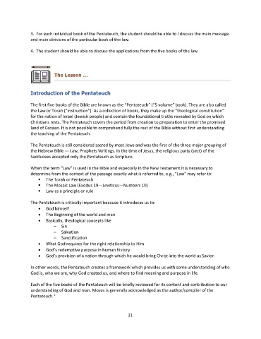 3. For each individual book of the Pentateuch, the student should be able to l discuss the main message