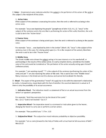 C. Voice – Grammatical voice indicates whether the subject is the performer of the action of the verb or