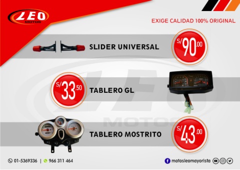 EXIGE CALIDAD 100% ORIGINAL S/ SLIDER UNIVERSAL 90 .00 33 .50 TABLERO GL S/ 43 .00 S/ TABLERO MOSTRITO 01-5369336 | 966 311 464 motosleomayorista