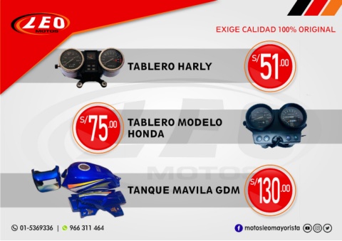 EXIGE CALIDAD 100% ORIGINAL S/ TABLERO HARLY 51 .00 75 .00 HONDA S/ TABLERO MODELO 130 .00 S/ TANQUE MAVILA GDM 01-5369336 | 966 311 464 motosleomayorista