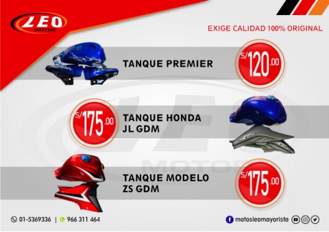 EXIGE CALIDAD 100% ORIGINAL 120 .00 S/ TANQUE PREMIER 175 .00 JL GDM S/ TANQUE HONDA TANQUE MODELO S/ 175 .00 ZS GDM 01-5369336 | 966 311 464 motosleomayorista