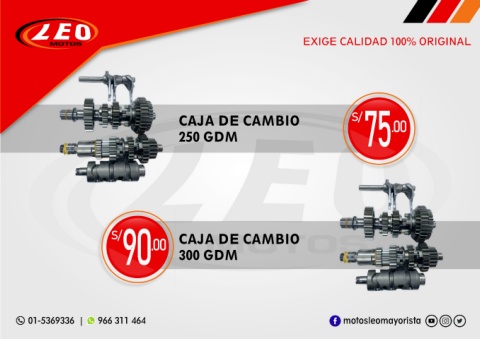 EXIGE CALIDAD 100% ORIGINAL CAJA DE CAMBIO S/ 75 .00 250 GDM 90 .00 300 GDM S/ CAJA DE CAMBIO 01-5369336 | 966 311 464 motosleomayorista