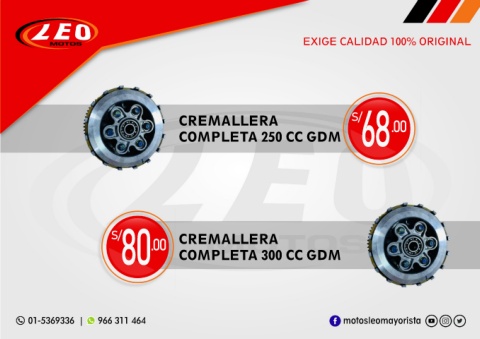 EXIGE CALIDAD 100% ORIGINAL CREMALLERA S/ 68 .00 COMPLETA 250 CC GDM 80 .00 COMPLETA 300 CC GDM S/ CREMALLERA 01-5369336 | 966 311 464 motosleomayorista