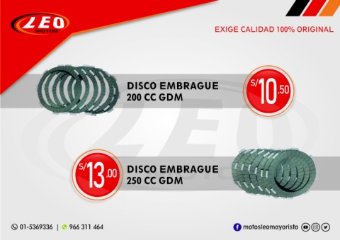 EXIGE CALIDAD 100% ORIGINAL DISCO EMBRAGUE S/ 10 .50 200 CC GDM 13 .00 250 CC GDM S/ DISCO EMBRAGUE 01-5369336 | 966 311 464 motosleomayorista