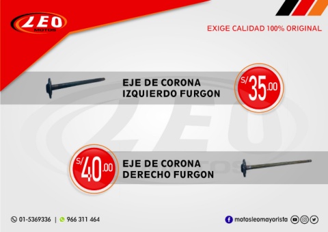 EXIGE CALIDAD 100% ORIGINAL EJE DE CORONA S/ 35 .00 IZQUIERDO FURGON 40 .00 DERECHO FURGON S/ EJE DE CORONA 01-5369336 | 966 311 464 motosleomayorista