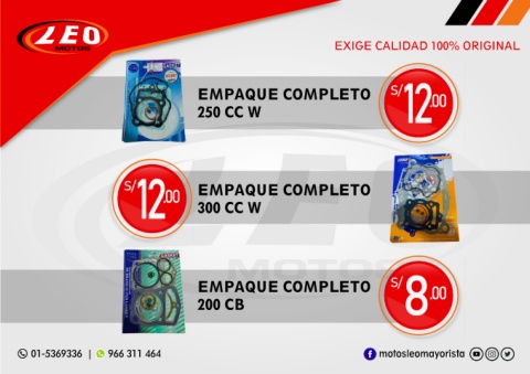 EXIGE CALIDAD 100% ORIGINAL EMPAQUE COMPLETO S/ 12 .00 250 CC W 12 300 CC W S/ EMPAQUE COMPLETO .00 EMPAQUE COMPLETO S/ 8 .00 200 CB 01-5369336 | 966 311 464 motosleomayorista