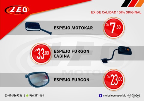 EXIGE CALIDAD 100% ORIGINAL S/ ESPEJO MOTOKAR 7 .50 33 .00 CABINA S/ ESPEJO FURGON 23 .00 S/ ESPEJO FURGON 01-5369336 | 966 311 464 motosleomayorista