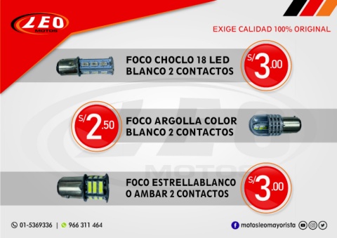 EXIGE CALIDAD 100% ORIGINAL 3 FOCO CHOCLO 18 LED S/ .00 BLANCO 2 CONTACTOS 2 BLANCO 2 CONTACTOS S/ FOCO ARGOLLA COLOR .50 3 FOCO ESTRELLABLANCO S/ .00 O AMBAR 2 CONTACTOS 01-5369336 | 966 311 464 motosleomayorista