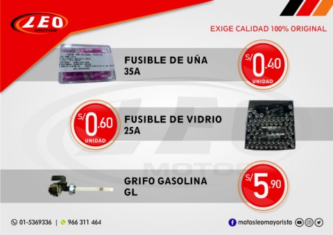 EXIGE CALIDAD 100% ORIGINAL FUSIBLE DE UÑA S/ 0 .40 35A UNIDAD 0 25A S/ FUSIBLE DE VIDRIO .60 UNIDAD S/ GRIFO GASOLINA 5 .90 GL 01-5369336 | 966 311 464 motosleomayorista