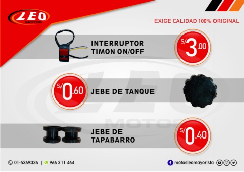 EXIGE CALIDAD 100% ORIGINAL 3 INTERRUPTOR S/ .00 TIMON ON/OFF 0 JEBE DE TANQUE S/ .60 JEBE DE S/ 0 .40 TAPABARRO 01-5369336 | 966 311 464 motosleomayorista