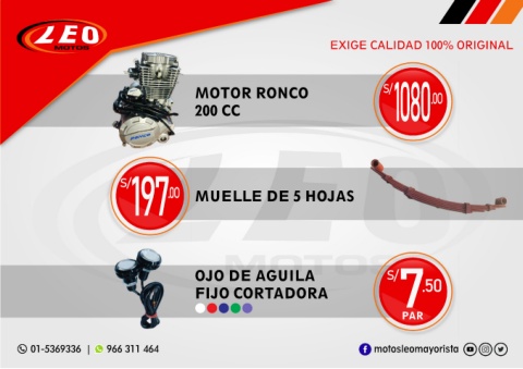 EXIGE CALIDAD 100% ORIGINAL MOTOR RONCO S/ 1080 .0O 200 CC 197 MUELLE DE 5 HOJAS S/ .0O OJO DE AGUILA S/ .50 FIJO CORTADORA 7 PAR 01-5369336 | 966 311 464 motosleomayorista