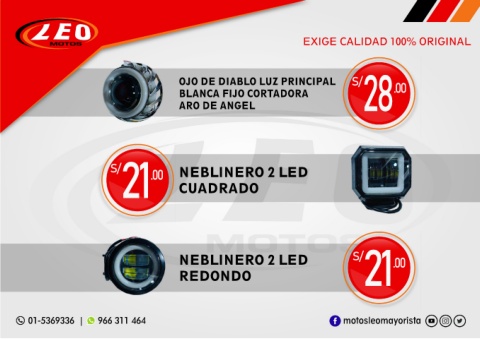 EXIGE CALIDAD 100% ORIGINAL OJO DE DIABLO LUZ PRINCIPAL S/ BLANCA FIJO CORTADORA 28 .00 ARO DE ANGEL 21 .00 CUADRADO S/ NEBLINERO 2 LED NEBLINERO 2 LED S/ 21 .00 REDONDO 01-5369336 | 966 311 464 motosleomayorista