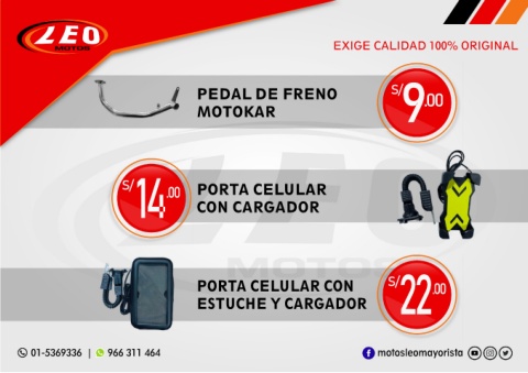 EXIGE CALIDAD 100% ORIGINAL 9 PEDAL DE FRENO S/ .00 MOTOKAR 14 .00 CON CARGADOR S/ PORTA CELULAR PORTA CELULAR CON S/ 22 .00 ESTUCHE Y CARGADOR 01-5369336 | 966 311 464 motosleomayorista