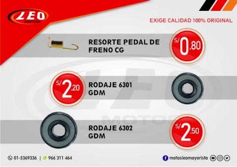 EXIGE CALIDAD 100% ORIGINAL RESORTE PEDAL DE S/ 0 .80 FRENO CG 2 GDM S/ RODAJE 6301 .20 RODAJE 6302 S/ 2 .50 GDM 01-5369336 | 966 311 464 motosleomayorista
