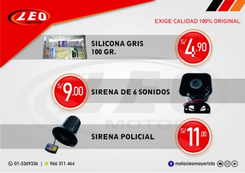 EXIGE CALIDAD 100% ORIGINAL 4 SILICONA GRIS S/ .90 100 GR. 9 SIRENA DE 6 SONIDOS S/ .00 11 .00 S/ SIRENA POLICIAL 01-5369336 | 966 311 464 motosleomayorista