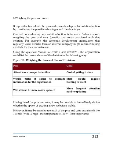 One aid to evaluating any solution/option is to use a 'balance sheet',