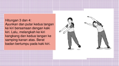 Hitungan 3 dan 4: Ayunkan dan putar kedua tangan ke kiri bersamaan dengan kaki kiri. Lalu, melangkah ke kiri kangkang dan kedua tangan ke samping kanan atas. Berat badan bertumpu pada kaki kiri.