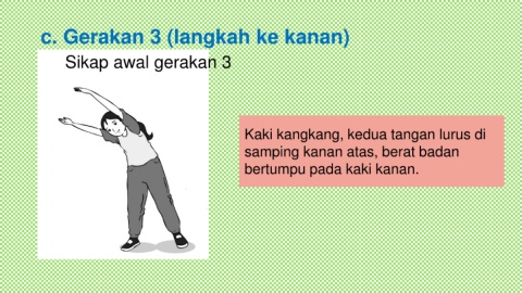 c. Gerakan 3 (langkah ke kanan) Sikap awal gerakan 3 Kaki kangkang, kedua tangan lurus di samping kanan atas, berat badan bertumpu pada kaki kanan.