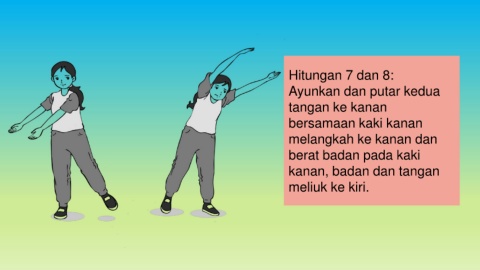 Hitungan 7 dan 8: Ayunkan dan putar kedua tangan ke kanan bersamaan kaki kanan melangkah ke kanan dan berat badan pada kaki kanan, badan dan tangan meliuk ke kiri.