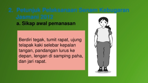 2. Petunjuk Pelaksanaan Senam Kebugaran Jasmani 2012 a. Sikap awal pemanasan Berdiri tegak, tumit rapat, ujung telapak kaki selebar kepalan tangan, pandangan lurus ke depan, lengan di samping paha, dan jari rapat.