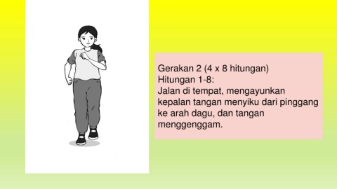 Gerakan 2 (4 x 8 hitungan) Hitungan 1-8: Jalan di tempat, mengayunkan kepalan tangan menyiku dari pinggang ke arah dagu, dan tangan menggenggam.