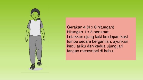 Gerakan 4 (4 x 8 hitungan) Hitungan 1 x 8 pertama: Letakkan ujung kaki ke depan kaki tumpu secara bergantian, ayunkan kedu asiku dan kedua ujung jari tangan menempel di bahu.