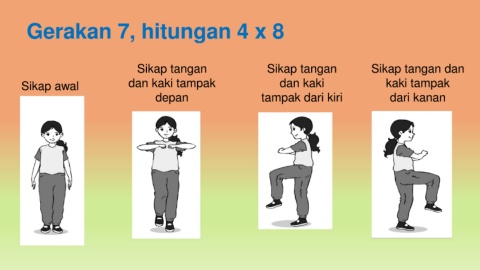 Gerakan 7, hitungan 4 x 8 Sikap tangan Sikap tangan Sikap tangan dan Sikap awal dan kaki tampak dan kaki kaki tampak depan tampak dari kiri dari kanan