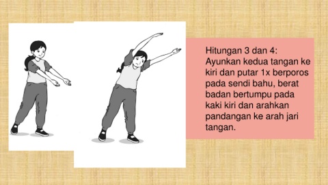 Hitungan 3 dan 4: Ayunkan kedua tangan ke kiri dan putar 1x berporos pada sendi bahu, berat badan bertumpu pada kaki kiri dan arahkan pandangan ke arah jari tangan.
