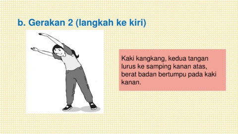 b. Gerakan 2 (langkah ke kiri) Kaki kangkang, kedua tangan lurus ke samping kanan atas, berat badan bertumpu pada kaki kanan.