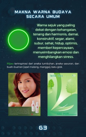 Hijau terinspirasi dari aneka tumbuhan, aneka sayuran, dan buah-buahan (apel malang, mangga), batu giok.