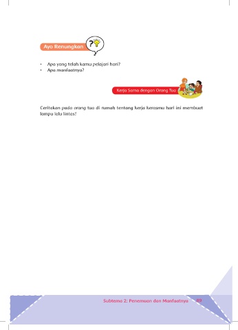 Ayo Renungkan • Apa yang telah kamu pelajari hari? • Apa manfaatnya? Kerja Sama dengan Orang Tua Ceritakan pada orang tua di rumah tentang kerja kerasmu hari ini membuat lampu lalu lintas! Subtema 2: Penemuan dan Manfaatnya 89