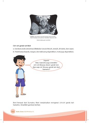 Beni berasal dari Sumatra. Beni menjelaskan mengenai ciri-ciri gerak tari