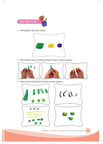 Ayo Mencoba 1. Menyiapkan alat dan bahan. 2. Membentuk atau membuat bagian-bagian pohon jagung. 3. Hasil jadi bentuk bagian-bagian pohon jagung. Subtema 3: Bangga Terhadap Daerah Tempat Tinggalku 173