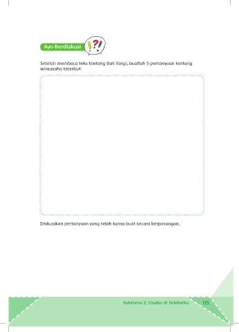 Ayo Berdiskusi Setelah membaca teks tentang Bali Tangi, buatlah 5 pertanyaan tentang wirausaha tersebut. Diskusikan pertanyaan yang telah kamu buat secara berpasangan. Subtema 2: Usaha di Sekitarku 115