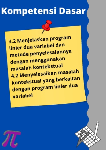 Kompetensi Dasar 3.2 Menjelaskan program linier dua variabel dan metode penyelesaiannya dengan menggunakan masalah kontekstual 4.2 Menyelesaikan masalah kontekstual yang berkaitan dengan program linier dua variabel