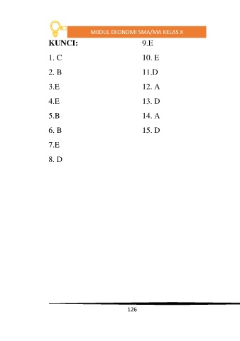 M0DUL EKONOMI SMA/MA KELAS X KUNCI: 9.E 1. C 10. E 2. B 11.D 3.E 12. A 4.E 13. D 5.B 14. A 6. B 15. D 7.E 8. D 126