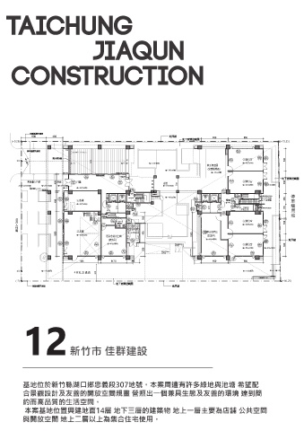 Taichung JIAQUN Construction 12 新竹市 佳群建設 基地位於新竹縣湖口鄉忠義段307地號。本案周遭有許多綠地與池塘 希望配 合景觀設計及友善的開放空間規畫 營照出一個兼具生態及友善的環境 達到簡 約而高品質的生活空間。 本案基地位置興建地面14層 地下三層的建築物 地上一層主要為店舖 公共空間 與開放空間 地上二層以上為集合住宅使用。